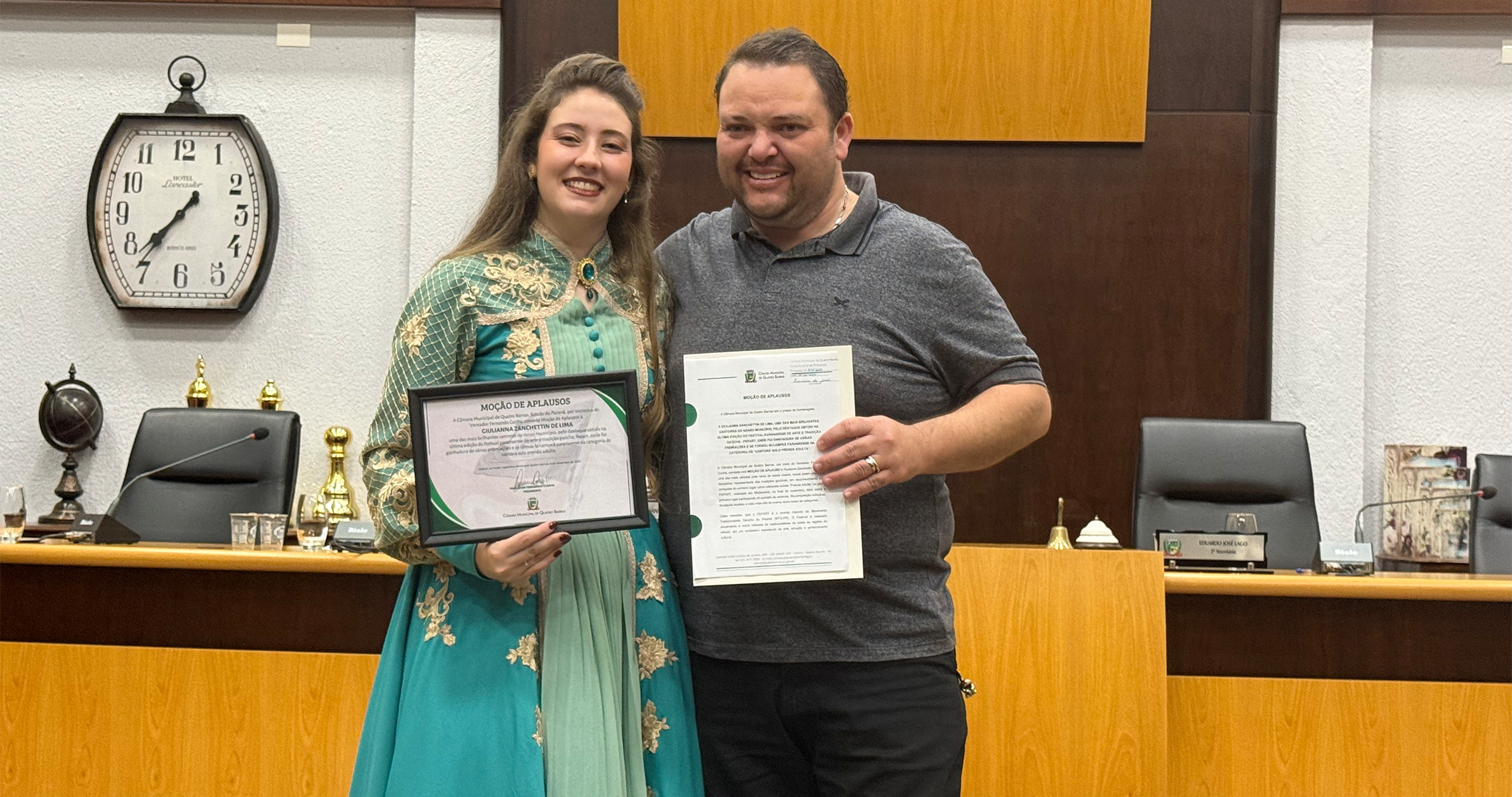 O presidente Fernando Cunha também prestou homenagem à artista local Giulianna Zanchettin de Lima, valorizando seu talento e múltiplas premiações obtidas como representante da cultura gaúcha regional.